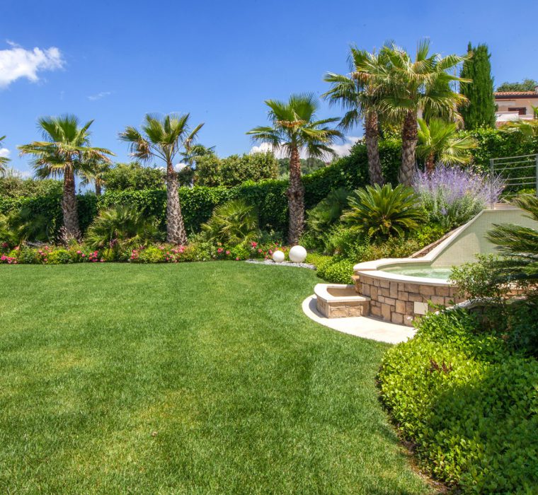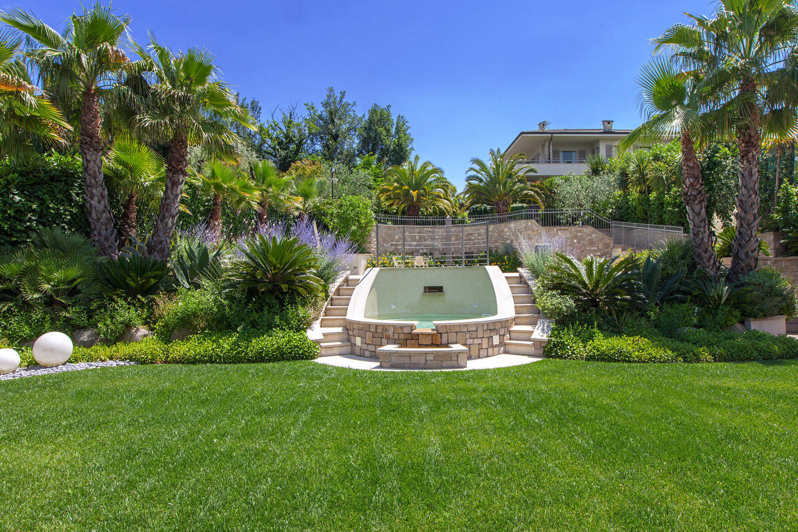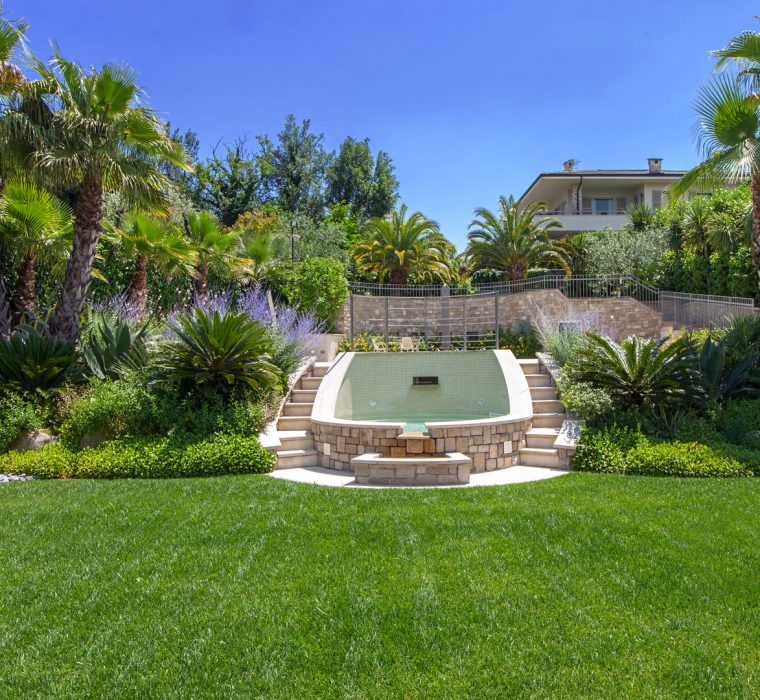 Per questo lavoro di progettazione del verde SF Landscape architecture e il garden designer Stefano Filippini hanno come sempre tenuto in considerazione la personalità e la destinazione d’uso degli spazi verdi. Ulivi e palmizi assecondano il gusto mediterraneo del committente rendendo il paesaggio armonico. Le fioriture sono state realizzate con arbusti i cui fiori sbocciano in diversi momenti dell’anno, prolungando la fioritura fino all’autunno inoltrato. Massima attenzione anche per le scarpate e le barriere, infittite per preservare la privacy. Completa il tutto un accurato studio di illuminazione che esalta chiome e tronchi creando un piacevole effetto scenografico. Il medesimo fascino si ritrova anche nella piscina, la quale dà vita a una cascata che sfocia nella vasca idromassaggio.