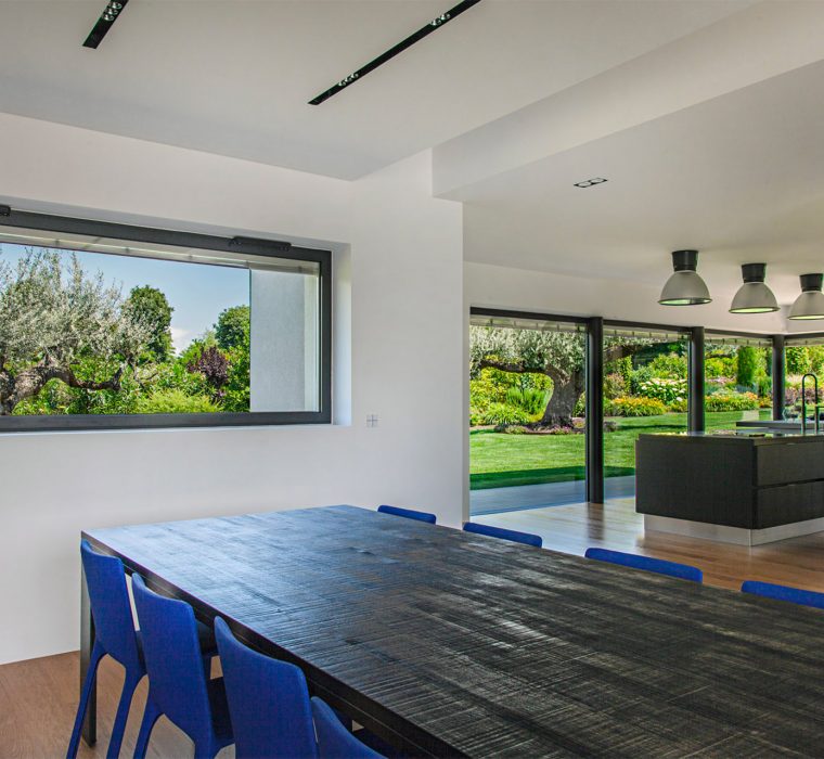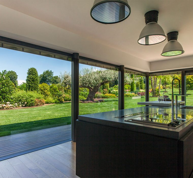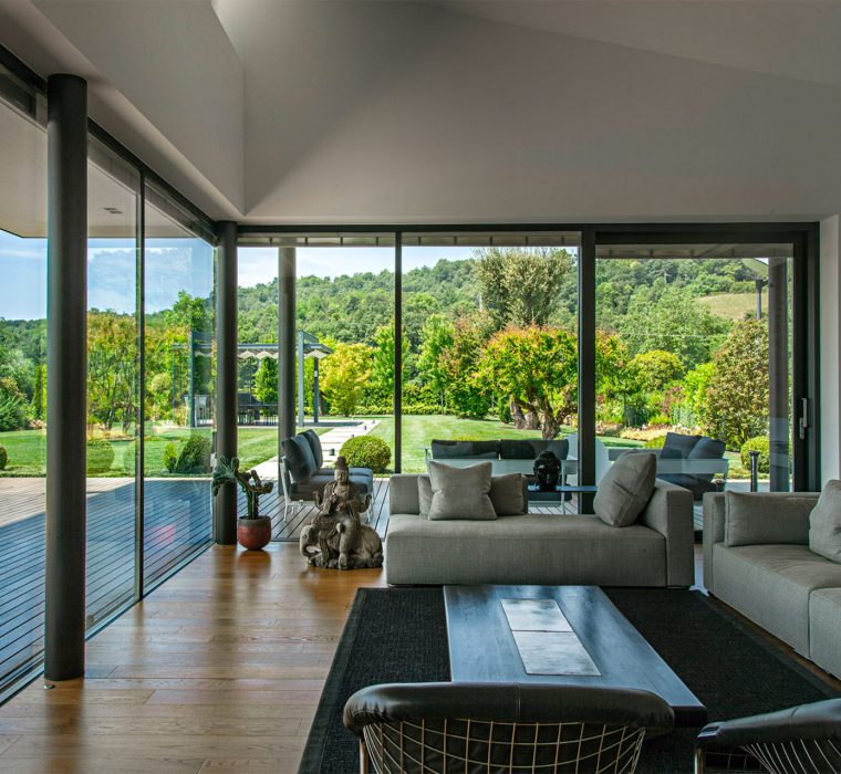 La proprietà è situata a Lonato del Garda, al centro di un aulico paesaggio rurale. Apparentemente in forte contrasto, l’architettura si inserisce in modo armonioso nell’ambiente circostante grazie al giardino che funge da punto di connessione tra l’edificio moderno e il contesto rustico.