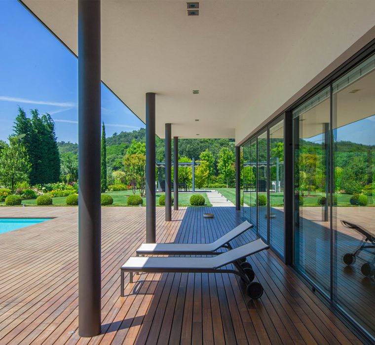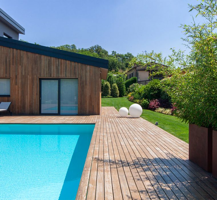 Tra le piante esemplari spiccano Ulivi, Aceri, Melograni. Le bordure altro non sono che grandi macchine di cespugli colorati, con un mix di essenze in un’alternanza di fioriture che si alternano durante tutta la bella stagione. Il solarium in legno rende particolarmente piacevole il camminamento a piedi nudi. Attorno alla piscina esemplari di buxus conferiscono simmetria e dinamicità, mentre la parete di gelsomino diffonde un gradevole profumo. Completano il progetto gli impianti di illuminazione e irrigazione appositamente studiati in ottica sostenibile e completamente interfacciati con la domotica KNX della casa.