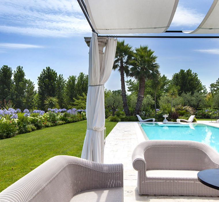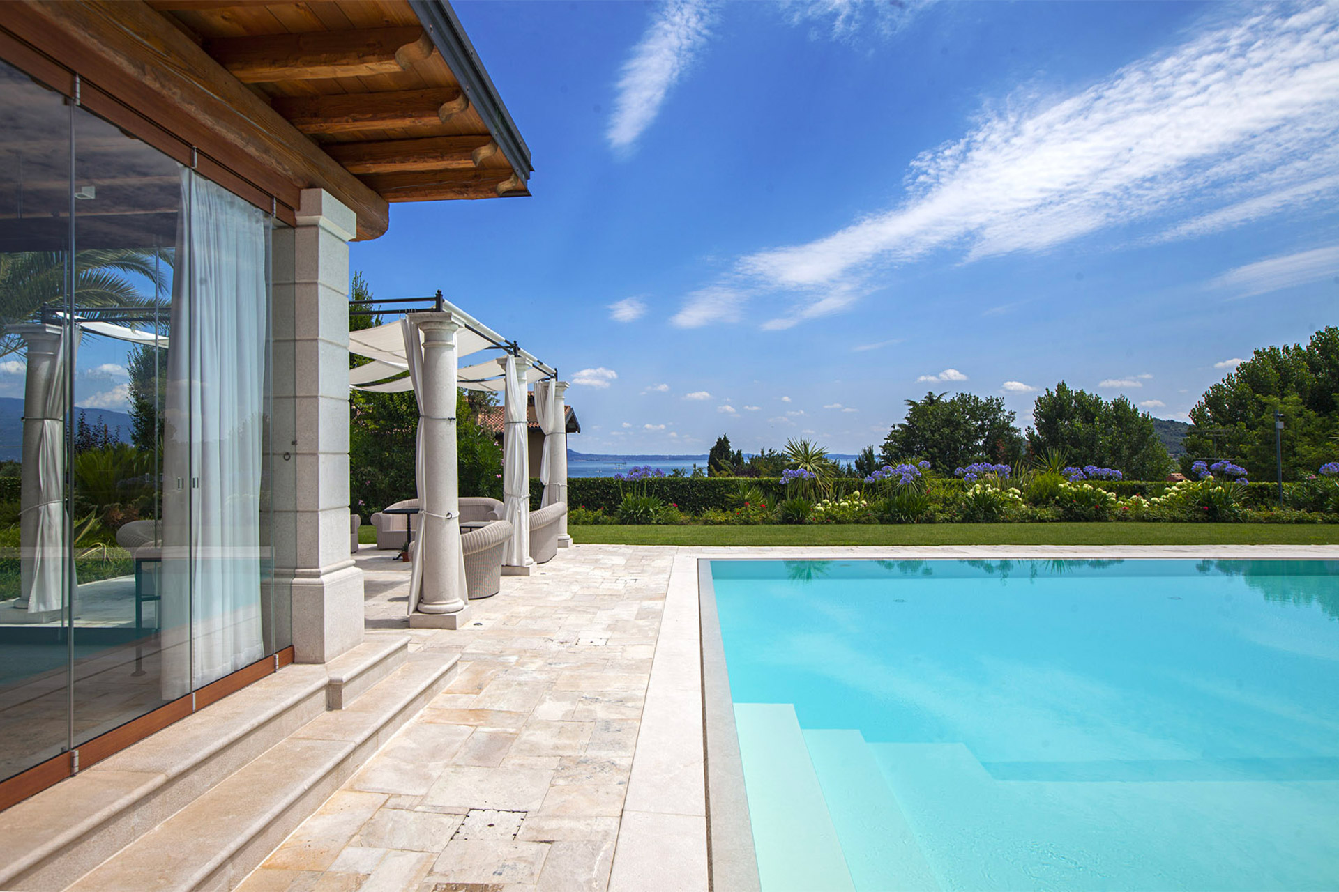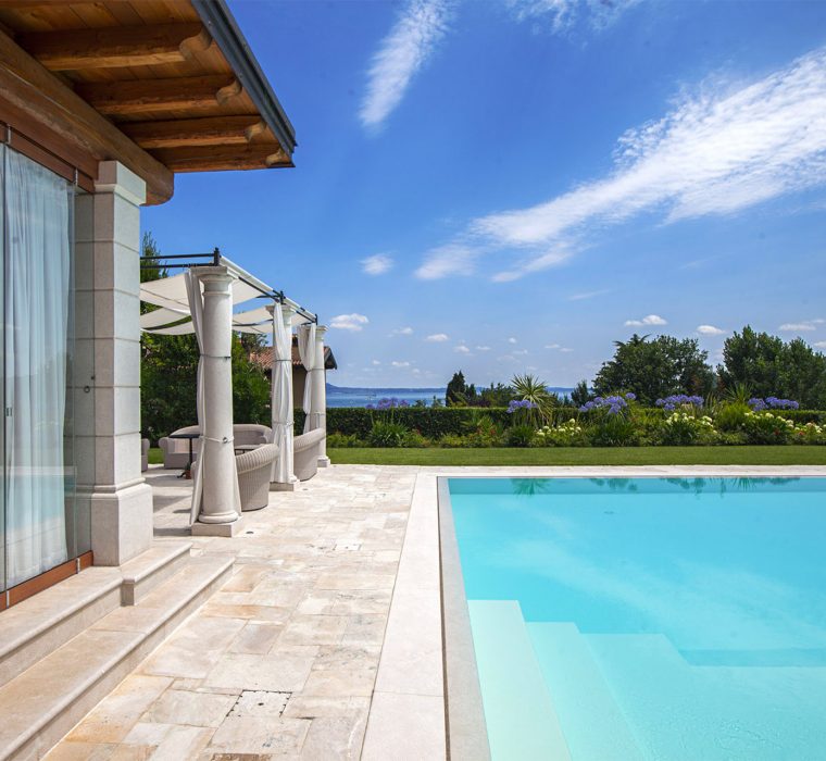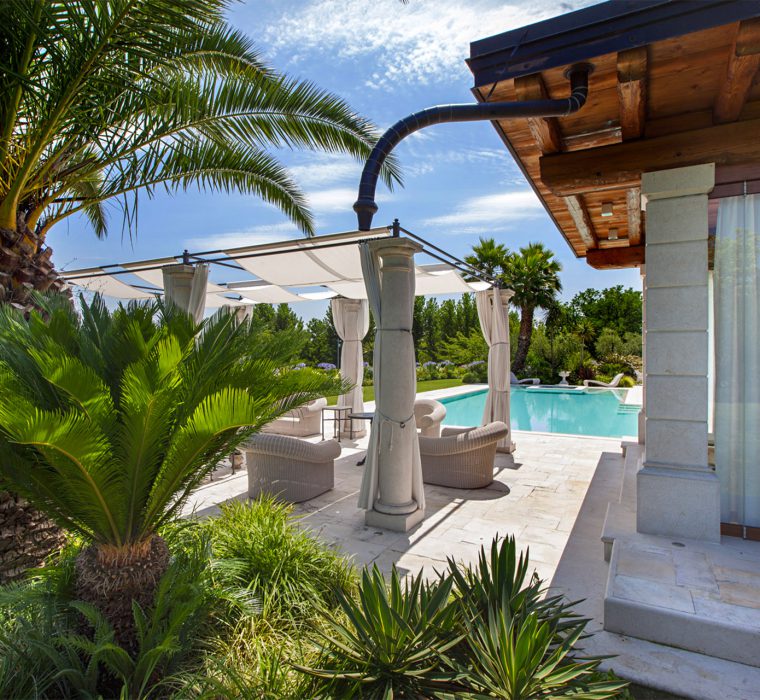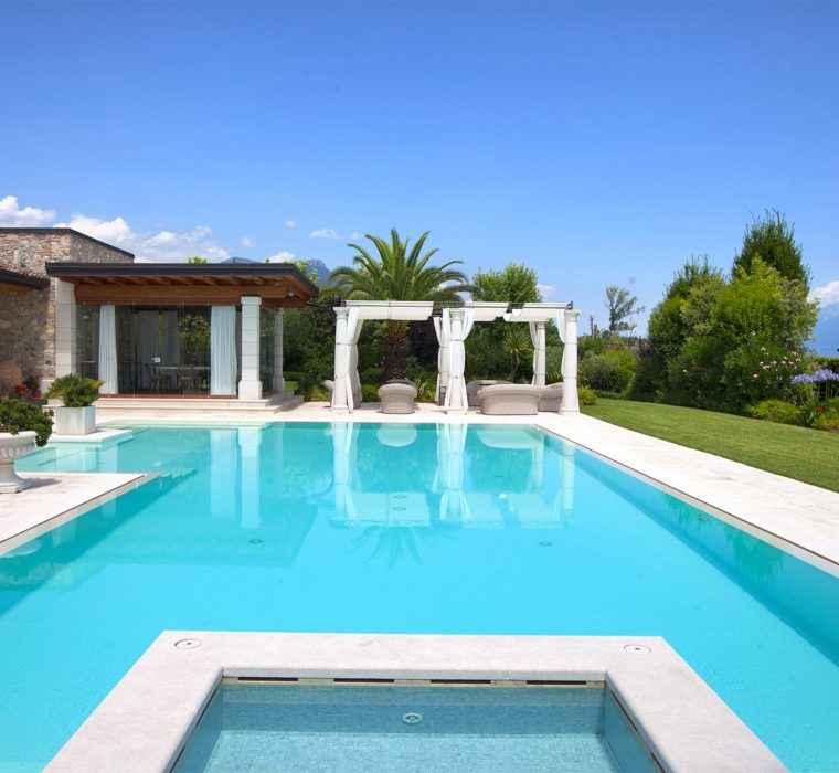 Molto particolare la vasca, con la presenza di getti a idromassaggio e comodi scalini per la discesa. Sul bordo piscina è stato utilizzato il rinomato marmo di Botticino martellinato, mentre la pavimentazione circostante richiama l’aspetto rustico della casa.