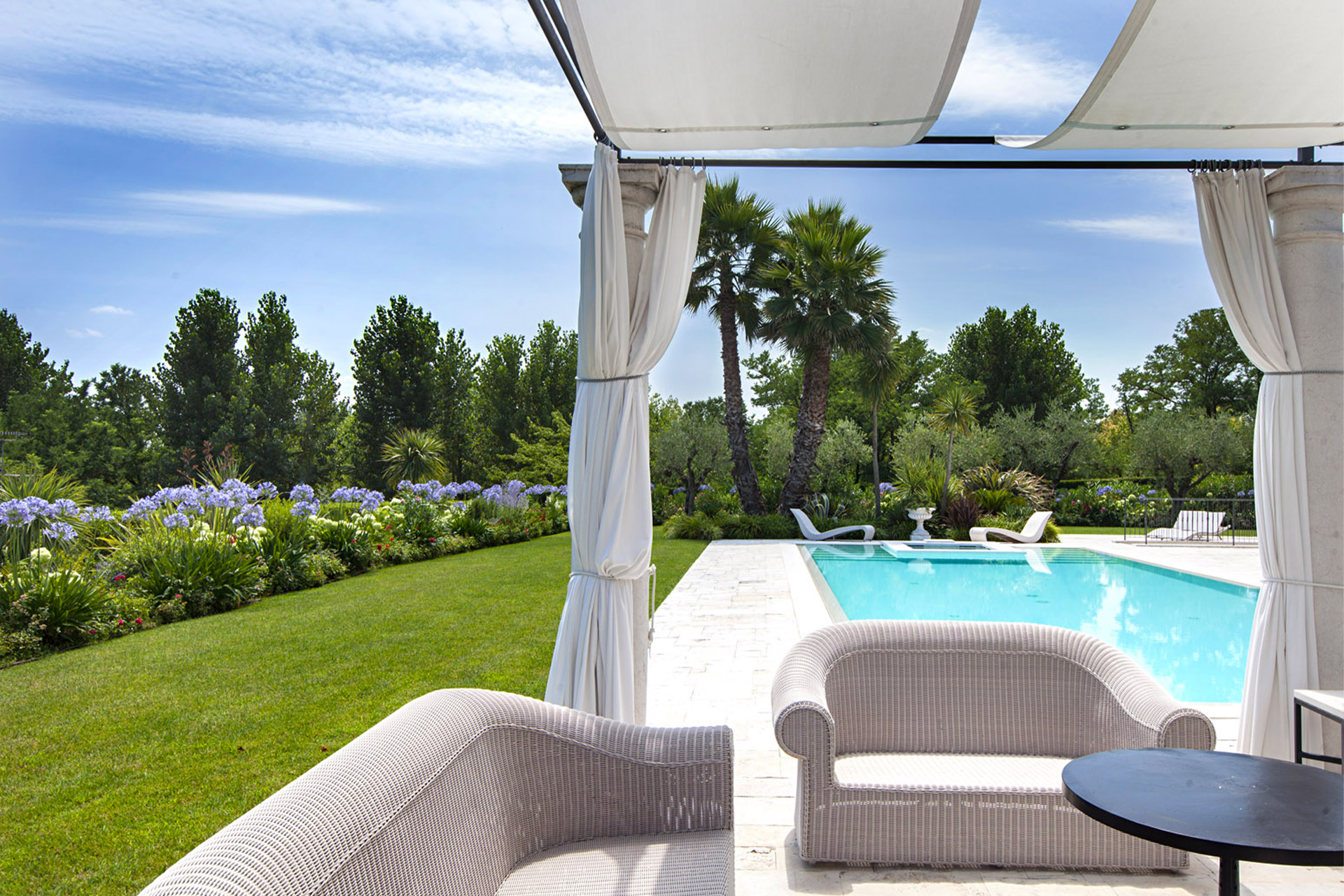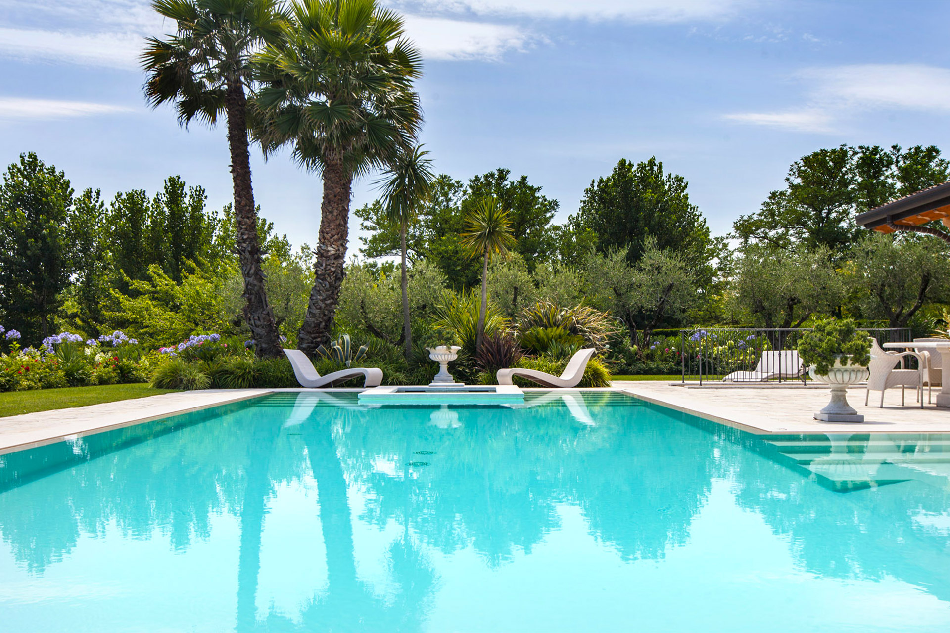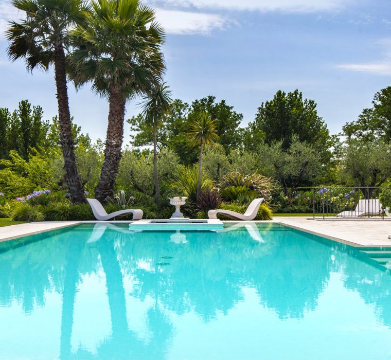 Molto particolare la vasca, con la presenza di getti a idromassaggio e comodi scalini per la discesa. Sul bordo piscina è stato utilizzato il rinomato marmo di Botticino martellinato, mentre la pavimentazione circostante richiama l’aspetto rustico della casa.