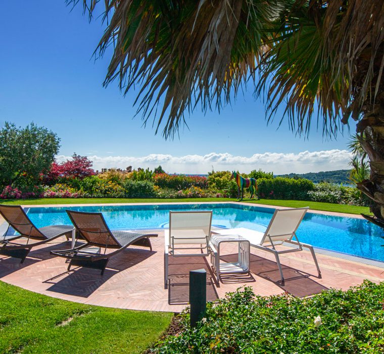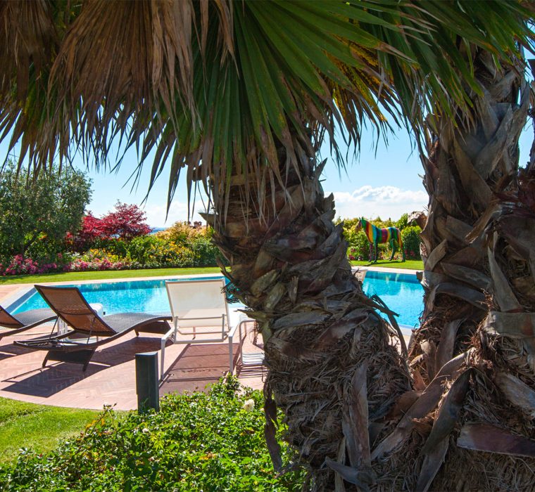 Percorrendo uno dei sentieri giungiamo nell’area piscina, da cui si ammira uno straordinario colpo d’occhio frontale sul lago. La vista sui residence adiacenti è stata celata con l’inserimento di piante sempreverdi e di alberature decidue per le grandi chiome ed ombre estive.